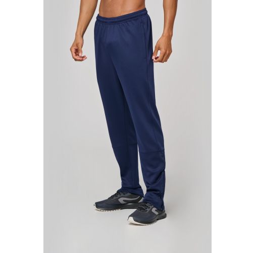 80% algodón / 20% poliéster. Felpa perchada de 2 hilos. Corte recto. 2 bolsillos laterales. Cintura elástica con cordón plano. Bajo de la pierna de canalé.